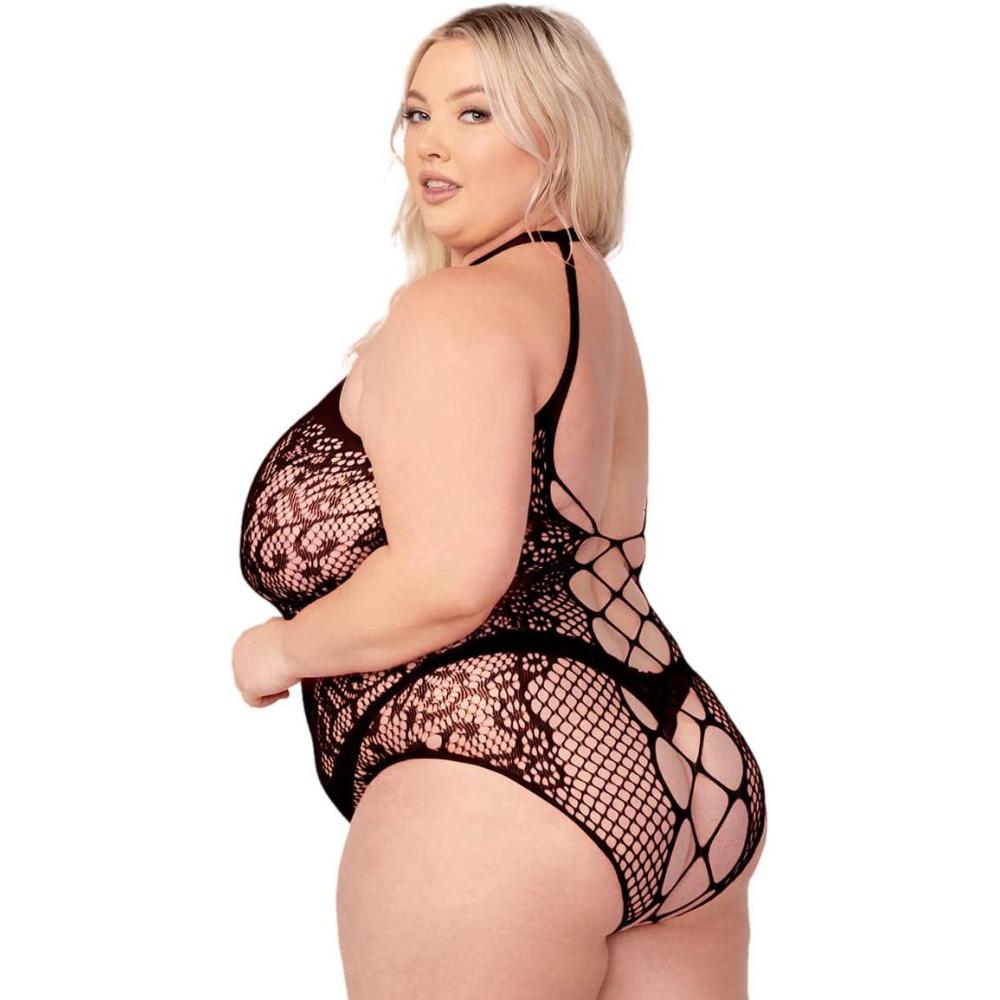 Take your lust to new heights in this exclusive plus size teddy featuring a high multi-strapped neckline with a back hook closure, a sheer lace and fishnet bodice, a wide net back panel, an open crotch, and a cheeky cut back (Panty not included.)